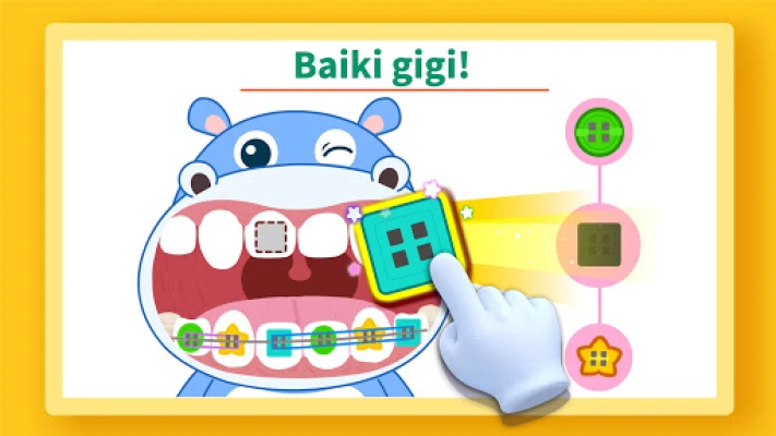 Cabaran sebenar menanti! Si badak air kecil sedang diserang oleh 'kupu-kupu gigi' yang nakal, menyebabkan kaviti yang tidak diingini. Bolehkah anda mengenal pasti gigi mana yang rosak? Keluarkan gigi yang bermasalah dengan cermat, bersihkan segala kekotoran, hapuskan kuman, dan gantikan dengan gigi baharu yang sihat. Selain itu, si tikus kecil memerlukan sentuhan mahir anda untuk membaiki gigi sumbing. Asah dan gilap permukaannya, kemudian isi dengan tampalan yang sempurna agar giginya kembali utuh dan kuat. Tunjukkan kemahiran doktor gigi hebat anda!
