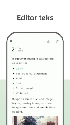 Luahkan kreativiti anda tanpa batasan dengan kemampuan meletakkan teks dan gambar secara bebas, membolehkan anda merangka kisah anda dalam susun atur yang unik dan menarik. Sesuaikan setiap aspek penulisan anda, dari warna fon dan saiz huruf hingga jarak baris dan penjajaran, memberikan anda kawalan penuh ke atas penampilan jurnal anda. Untuk memastikan segala-galanya teratur, anda boleh mengklasifikasikan entri anda menggunakan pelbagai tag – sama ada untuk catatan perjalanan, jurnal pembelajaran, atau sekadar luahan perasaan rahsia. Malah, cipta templat jurnal peribadi anda sendiri untuk mempercepatkan proses penulisan, mengelakkan pengulangan dan membebaskan anda untuk fokus pada inti cerita. Anda juga boleh menyesuaikan garis masa jurnal untuk paparan yang paling sesuai dengan gaya anda.